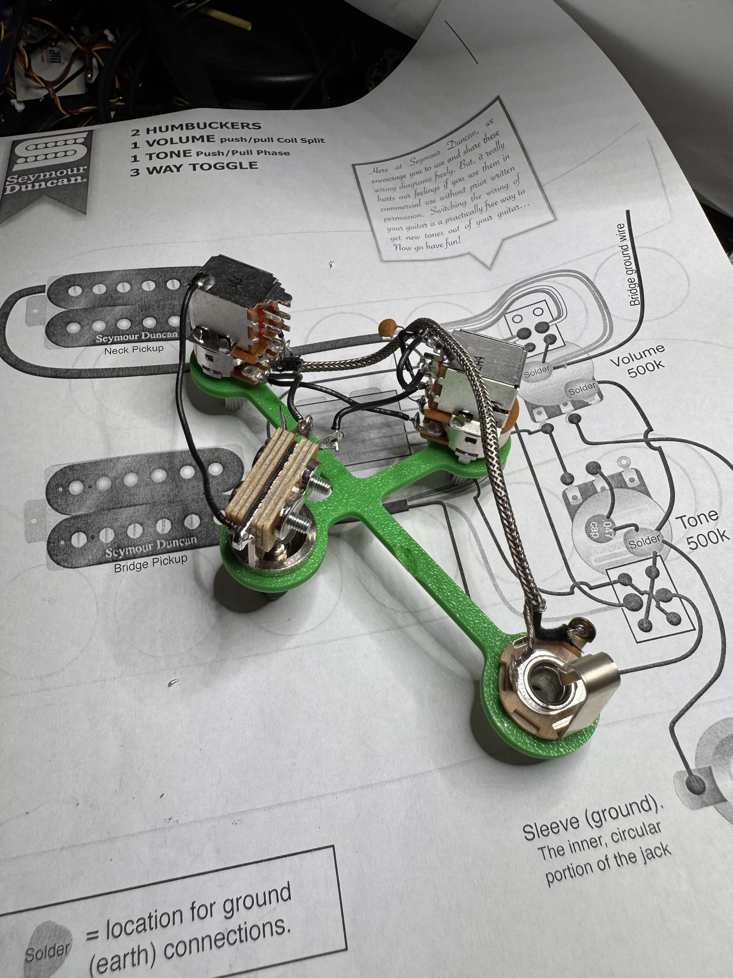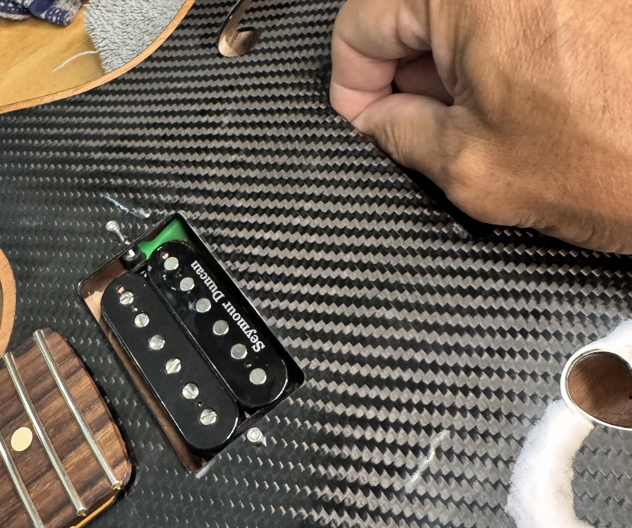 A 3d printed jig is included to help you wire up the electronics. It holds the components in position so you can wire them up as cleanly as possible. I usually leave the pickup wires uncut so that if you should ever swap them out the wires won’t be too short in another body. The aluminum blocks inside the body are unanodized and so are conductive. The carbon top is also conductive (along its edges), so you don’t need to run a ground wire – the build will have good continuity naturally.